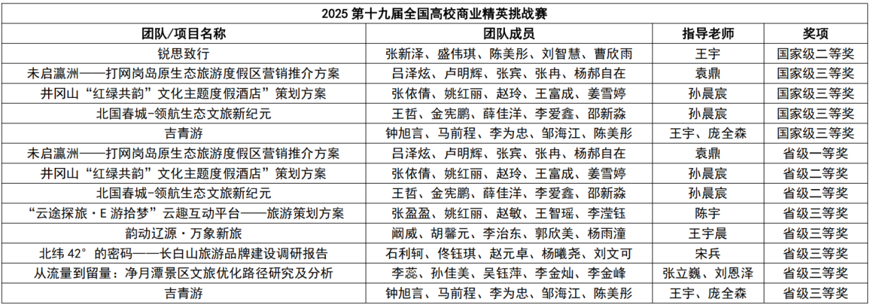 近期,2025年全国高校商业精英挑战赛创新创业竞赛全国总决赛及省级赛结果相继揭晓。我校参赛团队在不同赛道表现突出,共斩获国家级奖项5项、省级奖项8项,实现赛事成绩的新突破。我校教师王宇、袁鼎、孙晨宸在文旅与会展创新创业实践竞赛全国总决赛荣获“最佳指导教师奖”。同时,我校获评吉林省会展创新创业竞赛“优秀组织单位”。